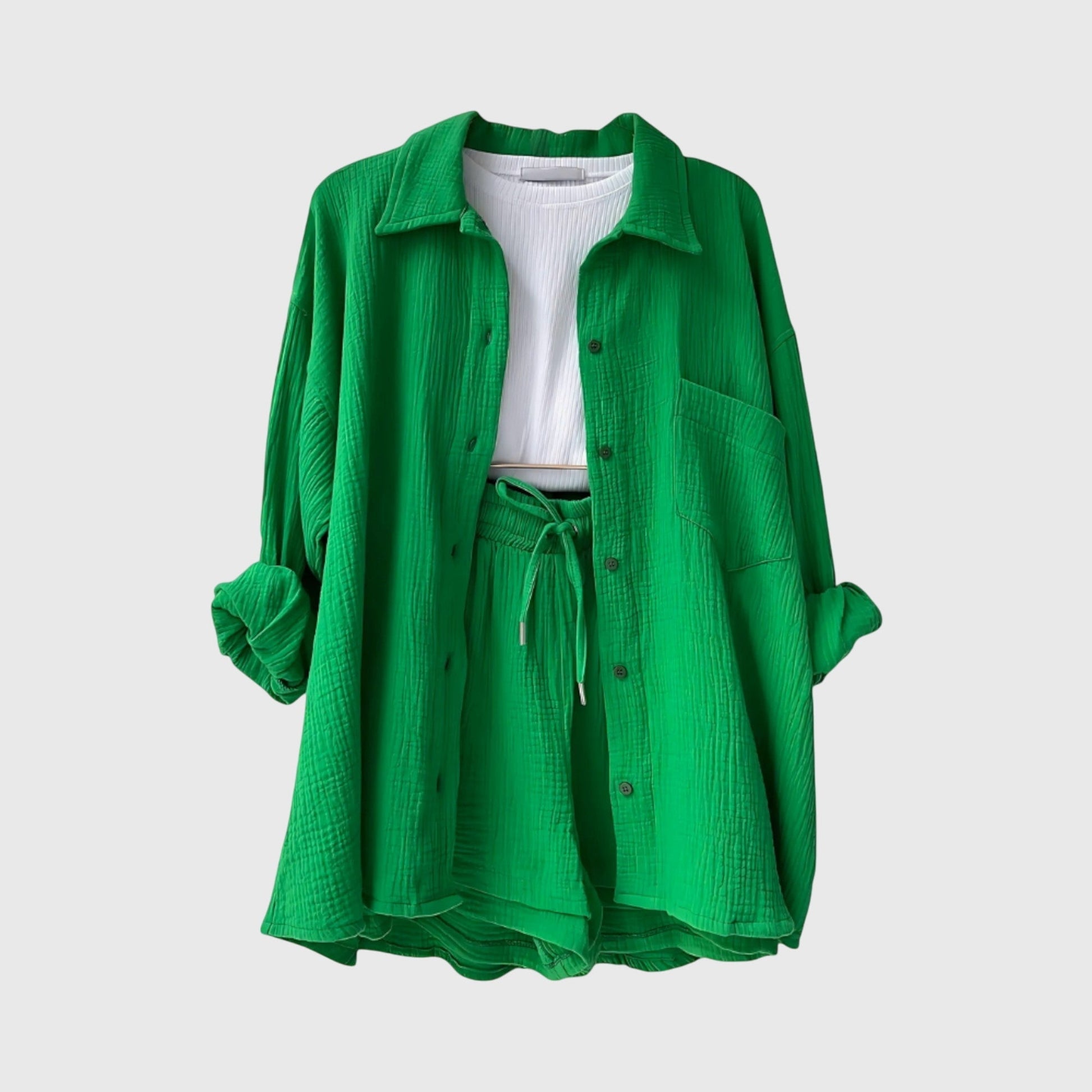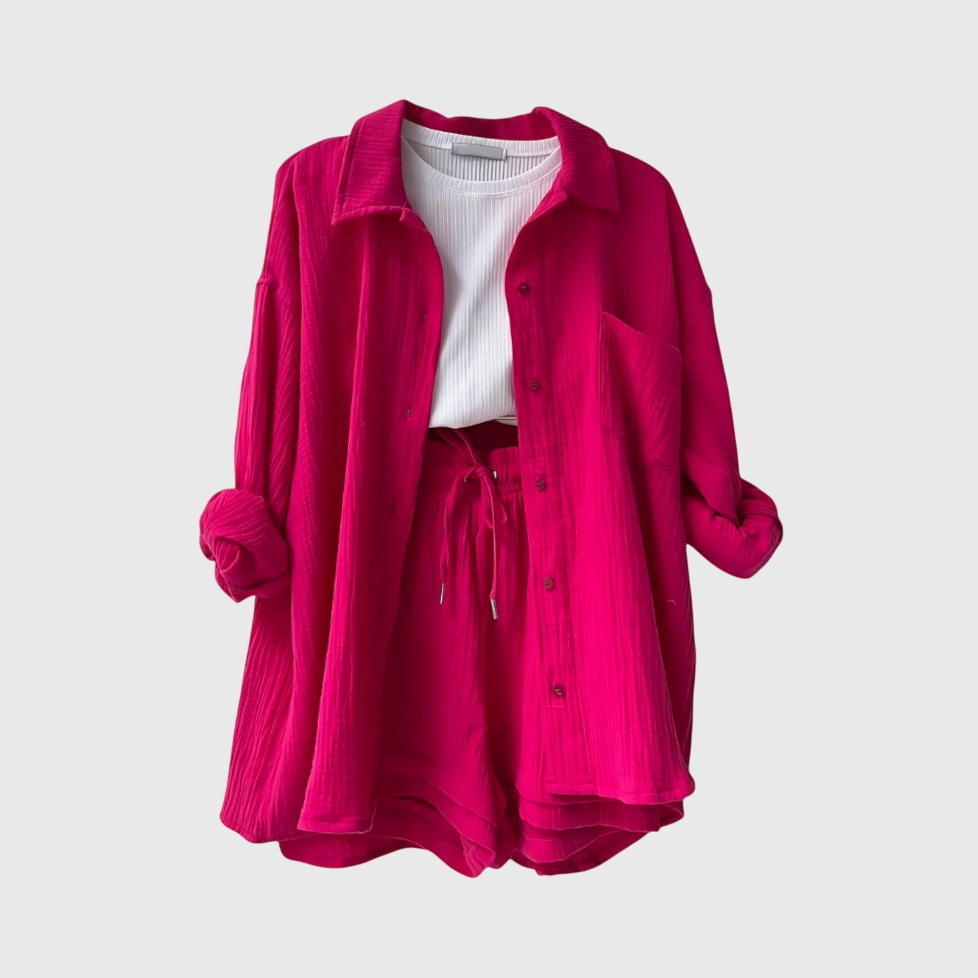 הסט המובנה של מיילי עם כפתורים משלב אלגנטיות ונוחות בדרכים שאין כמותן. בין אם מדובר בימים רגועים בבית, טיולים מרגשים או חופשות קיץ בלתי נשכחות – הסט הזה יהיה הפייבוריט החדש שלך.