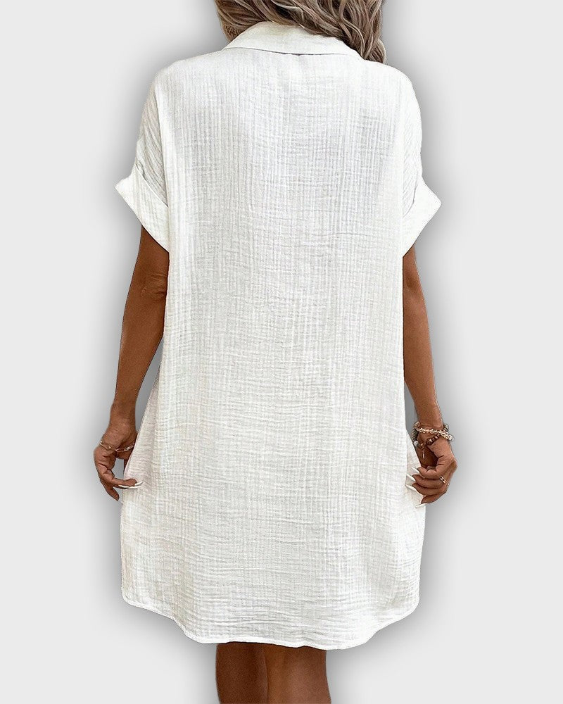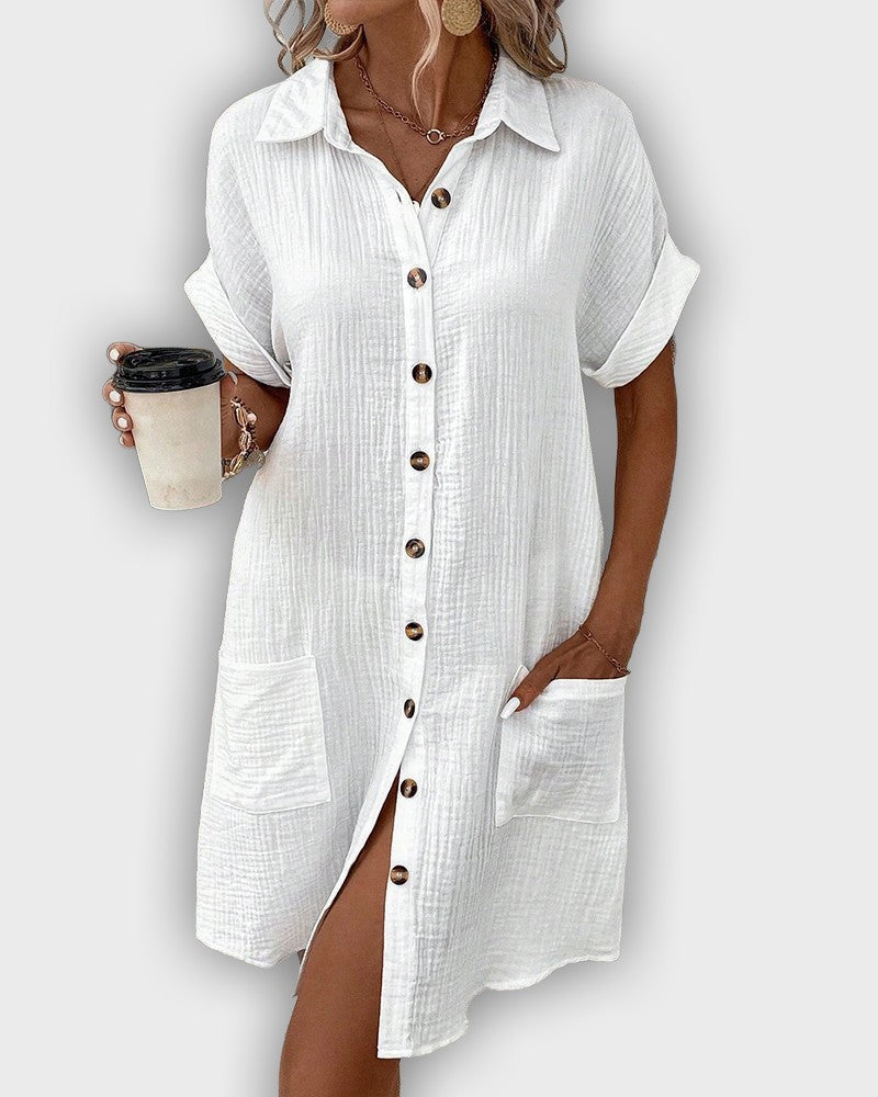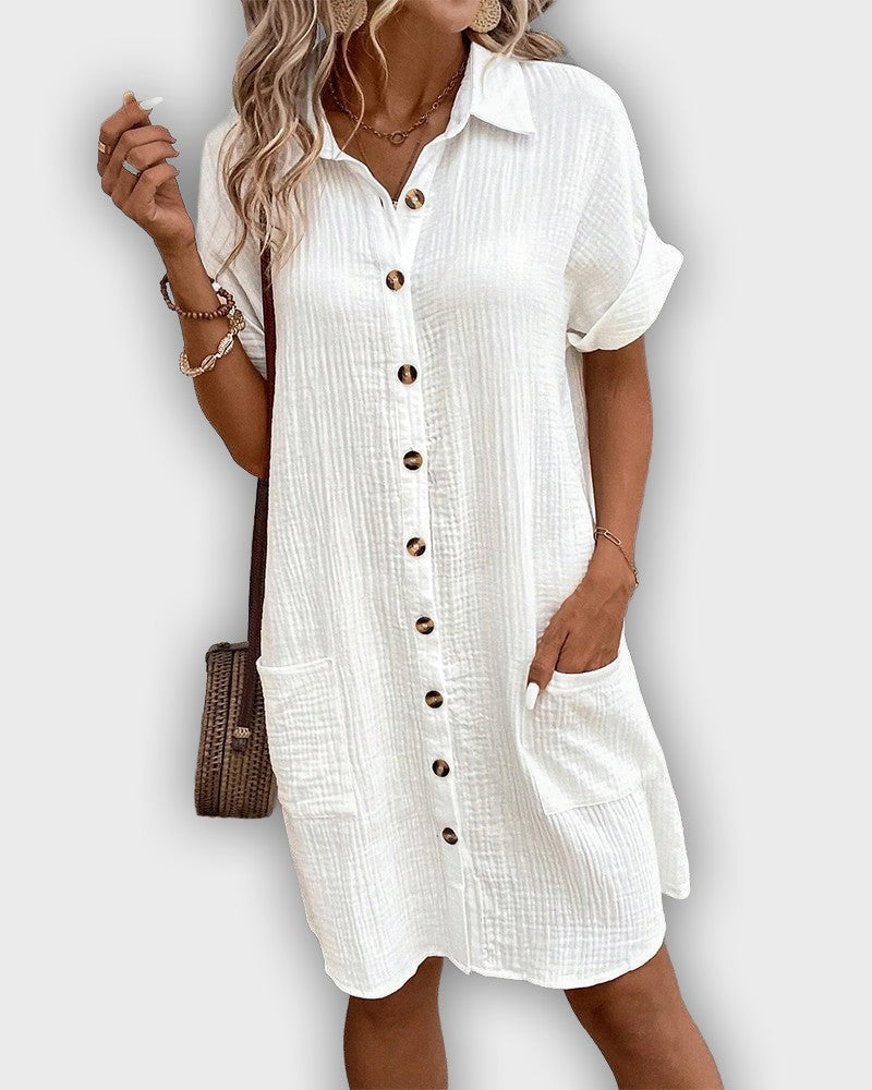 עם הכפתורים האלגנטיים והשרוולים המגולגלים, השמלה הזו משדרת אלגנטיות נינוחה שמתאימה לכל הזדמנות.