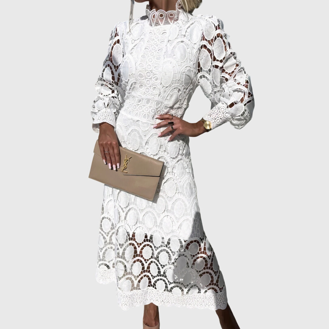 הקישוטים העדינים והשרוולים הארוכים והקצת נפוחים מעניקים לשמלה נופך של יוקרה. הצווארון הגבוה מספק מראה נצחי של nunca יוצא מהאופנה.
